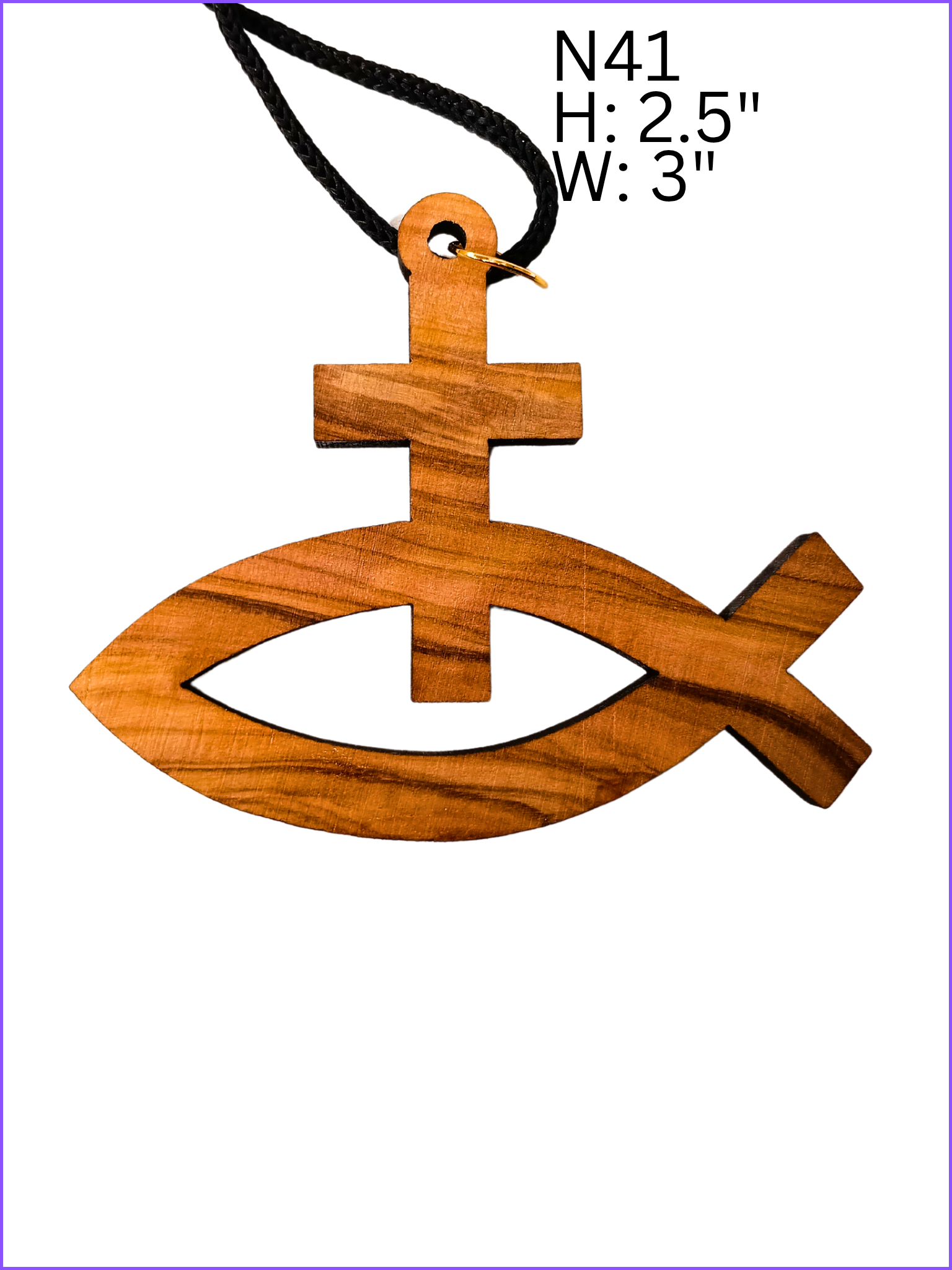 N41: NECKLACE CORD PACKAGED OLIVE WOOD HOLY LAND CROSS/FISH H: 2.5" W: 3" $2ea
