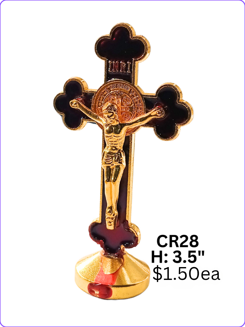 CR28: ALLOY H: 3.5" SAINT BENEDICT CRUCIFIX EASTERN ORTHODOX CRUCIFIX BURGUNDY/GOLD HOME/CAR STAND $1.50ea