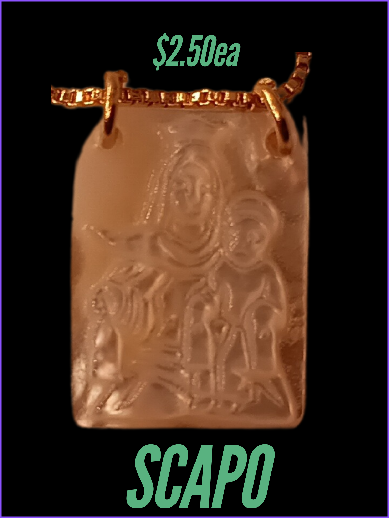 SCAP0: MOTHER OF PEARL SCAPULAR MARY WITH BABY HESUS GOLD PLATED CHAIN $2.50ea CHAIN L: 18" W: 0.5" H: 0.7"
